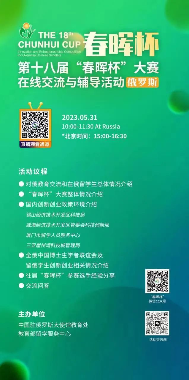 第十八屆“春暉杯”中國(guó)留學(xué)人員創(chuàng)新創(chuàng)業(yè)大賽在線交流與輔導(dǎo)活動(dòng)(俄羅斯)